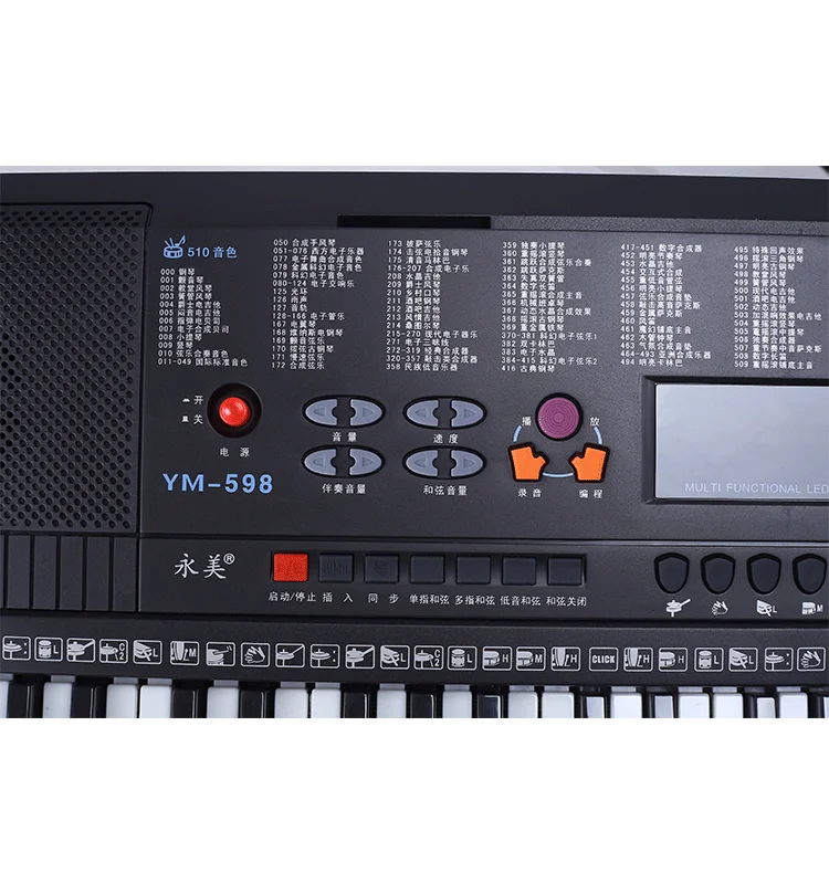 Function button | record, program, play, split, dual timbres, sync, start&stop, insert, single finger, multi-finger, bass, chord off, metro, demo one, demo all, sustain, vibrato | |