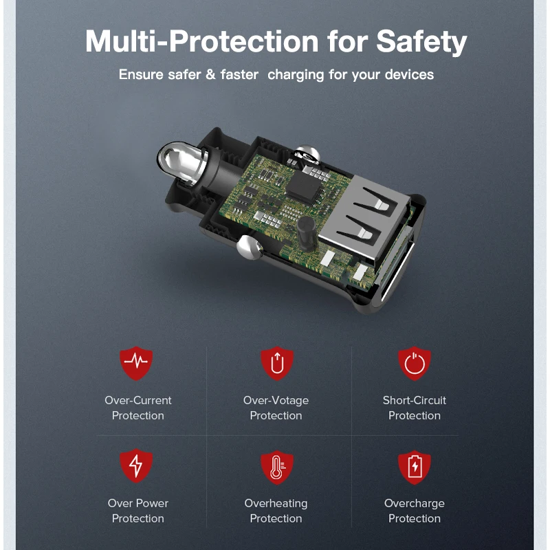 Зарядное мини-устройство работающее от прикуривателя-Дизайн Мини-автомобильного зарядного устройства экономит место на автомобиле, или идеально помещается в ладонь, пакет или карман.