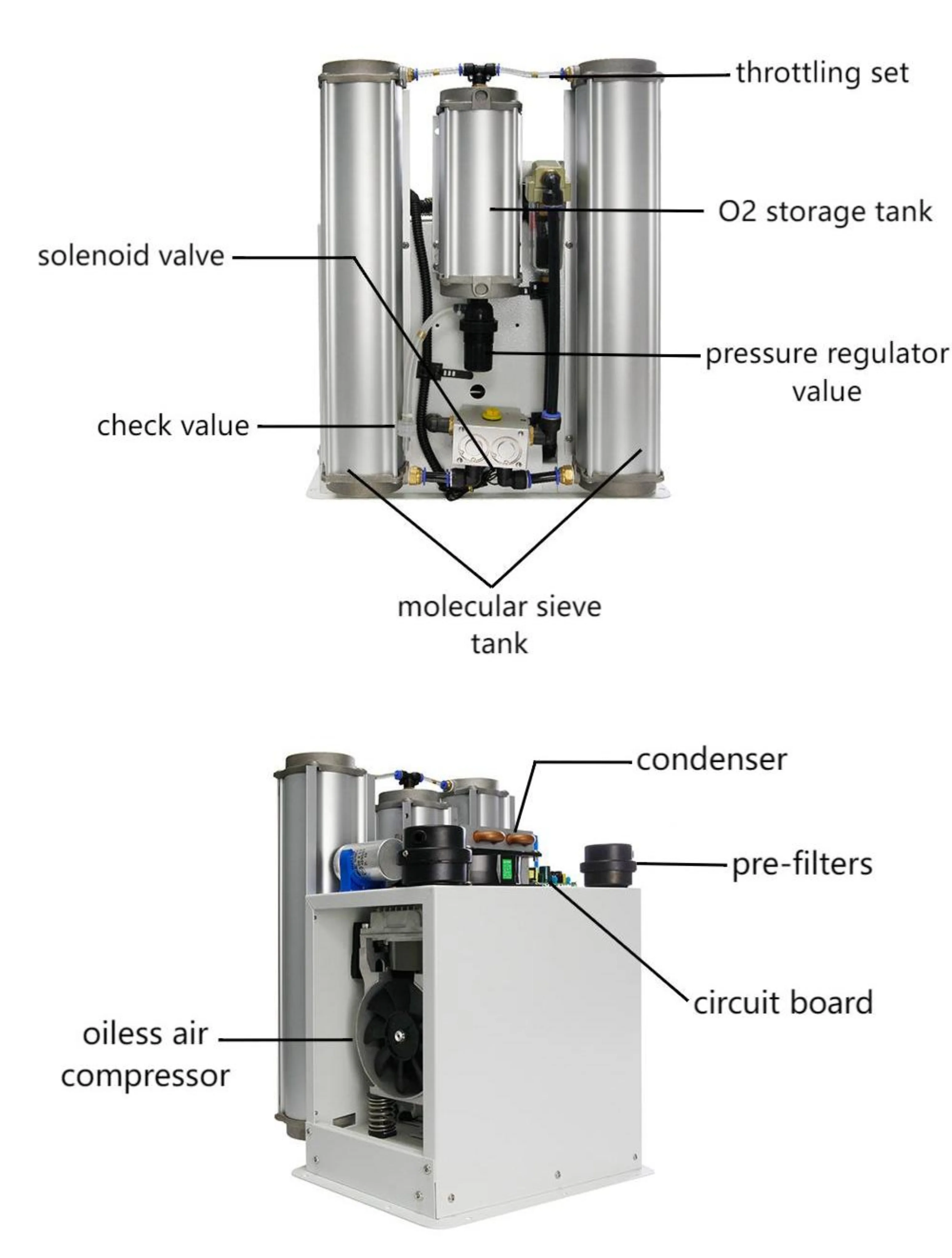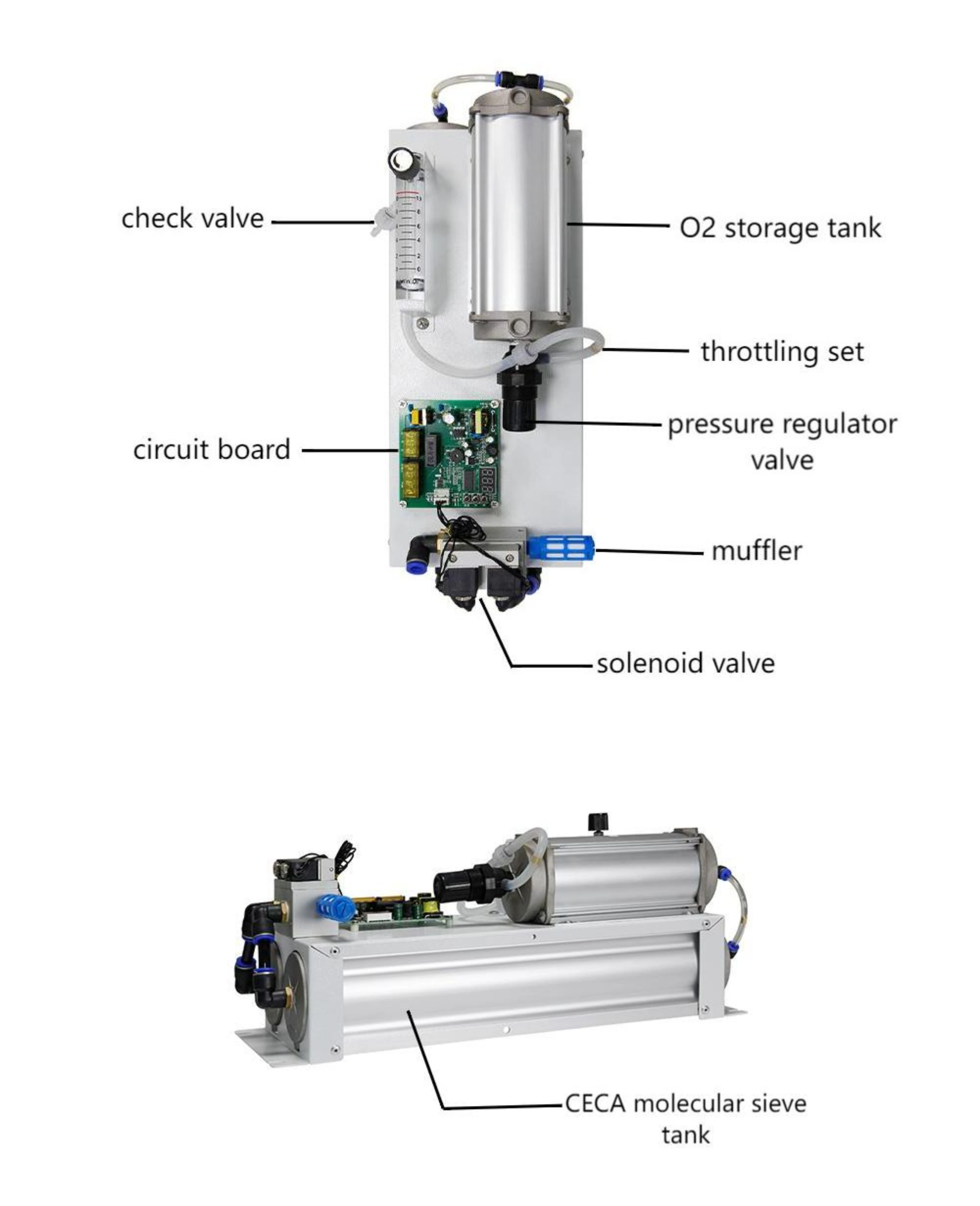 2. Using pressure sensing control mode to ensure that the working pressure of the molecular sieve in the best state.And oiless air compressor due to the change of voltage and the normal wear of each component caused by the change of gas pressure and flow can be effectively compensated to ensure the long-term stability of oxygen concentration and flow.