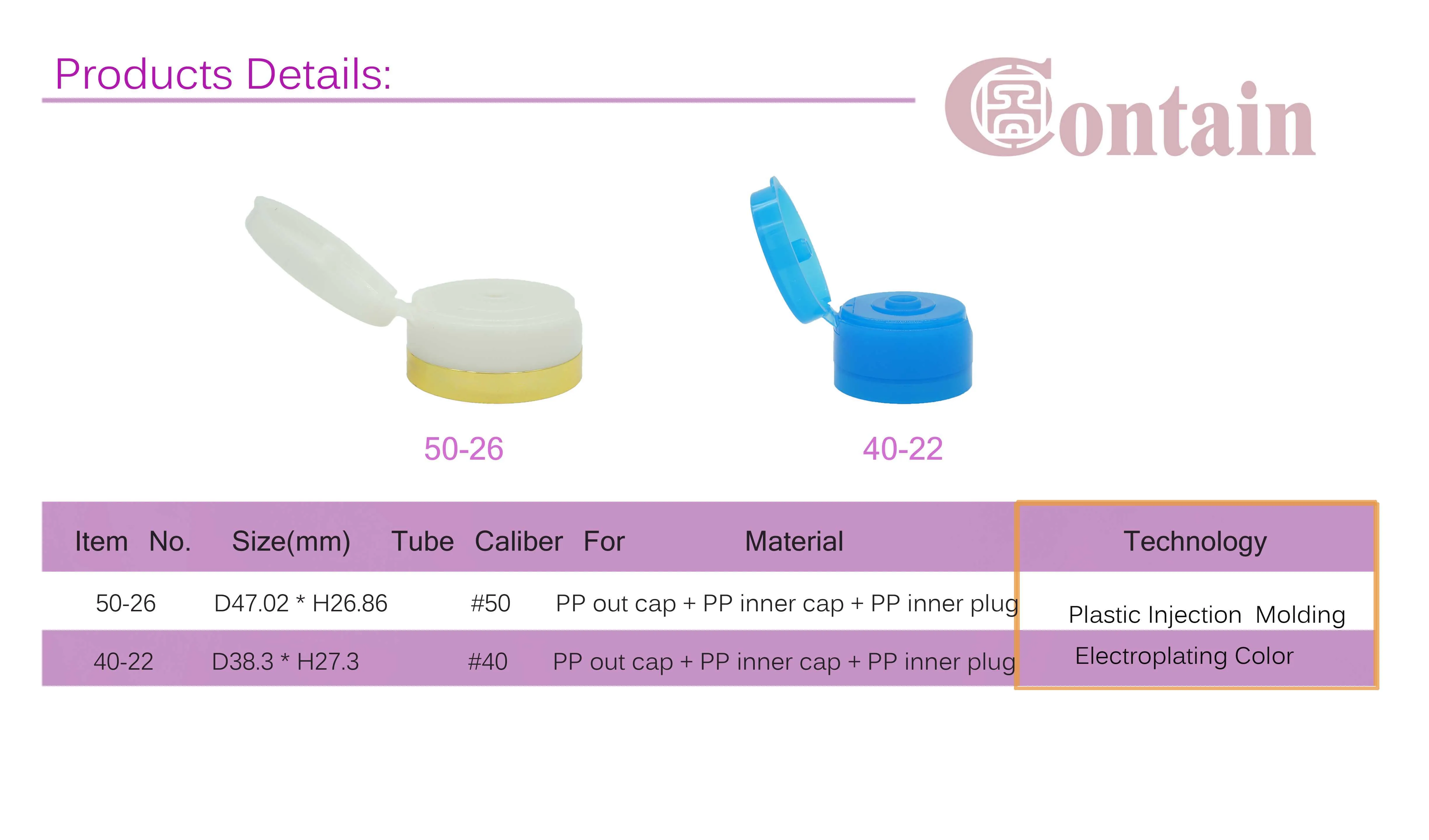 Screw cap for the round tube. The Plastic flip top cap has 2sizes, can fit the tube for #40,#50. Screw cap for 150ml shampoo tube ,repair cream tube ,100g calming mask tube and 120ml facial cleanser cosmetic tube and 180mlbody wash tube ,and also 200ml tube. The normal Plastic flip top cap just in one mould,when the cap and the tube are installed,many times there are cases where the cap and tube positions are not adjusted properly.With our flip cap,this not going happen.Our flip cap is made of 3 parts.The tooth cap, the middle cap and the top cap.With this design, the middle cap and the out cap can be rotate to erery angle,so it is easy to adjustment the top cap with the tube.3 parts withh 3 mould ,so the cap can be in 3 colors.Just depend on you need.