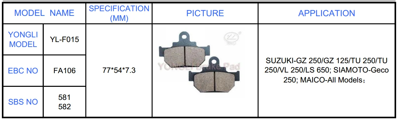 Applicable for : brake pad for SUZUKI-GZ 250/GZ 125/TU 250/TU 250/VL 250/LS 650; brake pad for SIAMOTO-Geco 250; brake pad for MAICO-All Models | Packaging Details | |||||