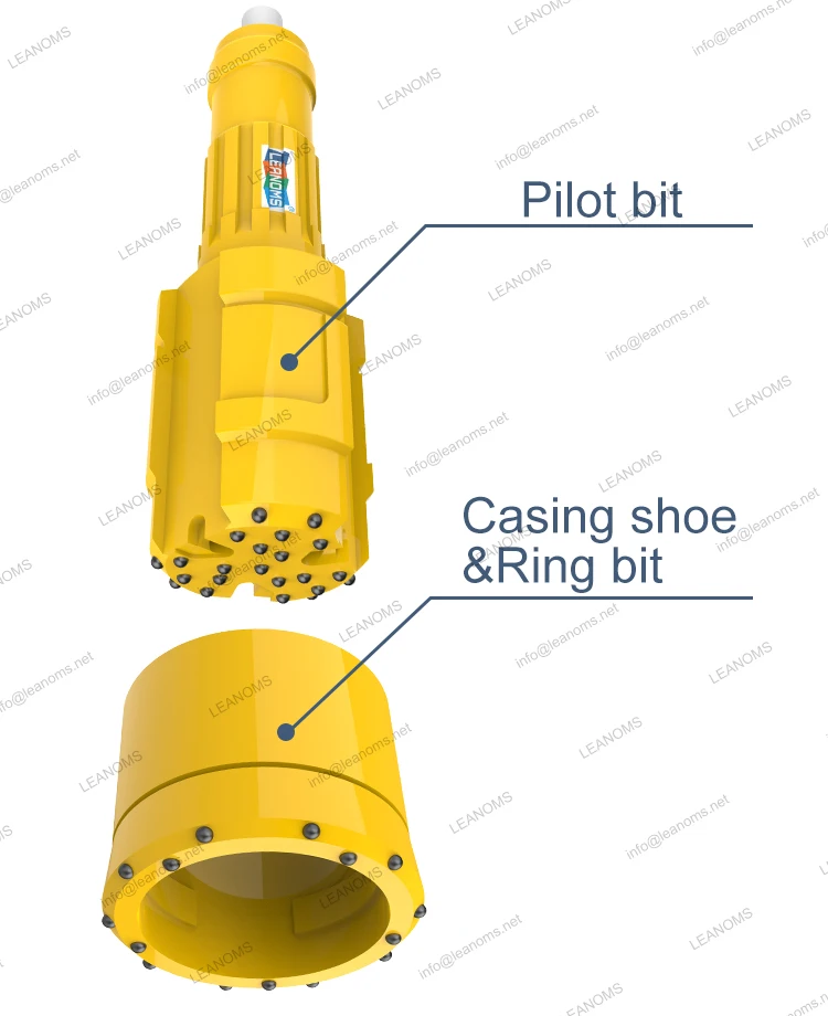 A symmetrical ring bit that is locked onto the pilot bit drills the void for the casing to advance down the hole. There are three different types of ring bit and cas- ing shoe assemblies;