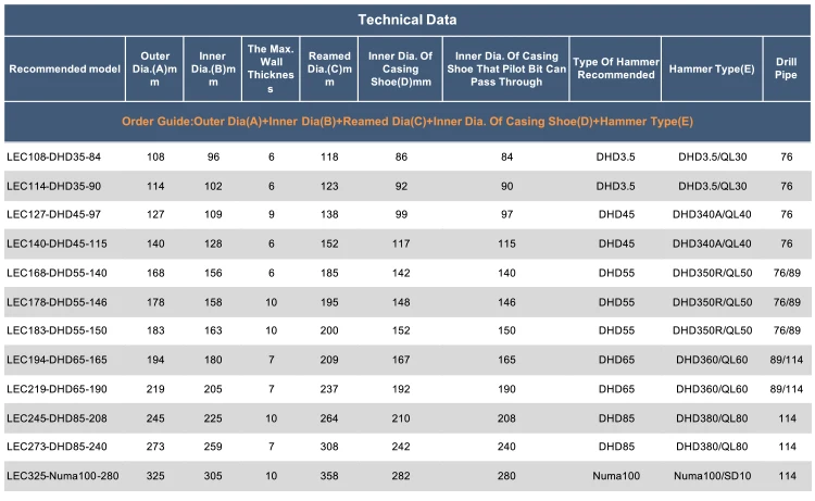The following ODEX dimensions are available for down-the-hole drilling:
