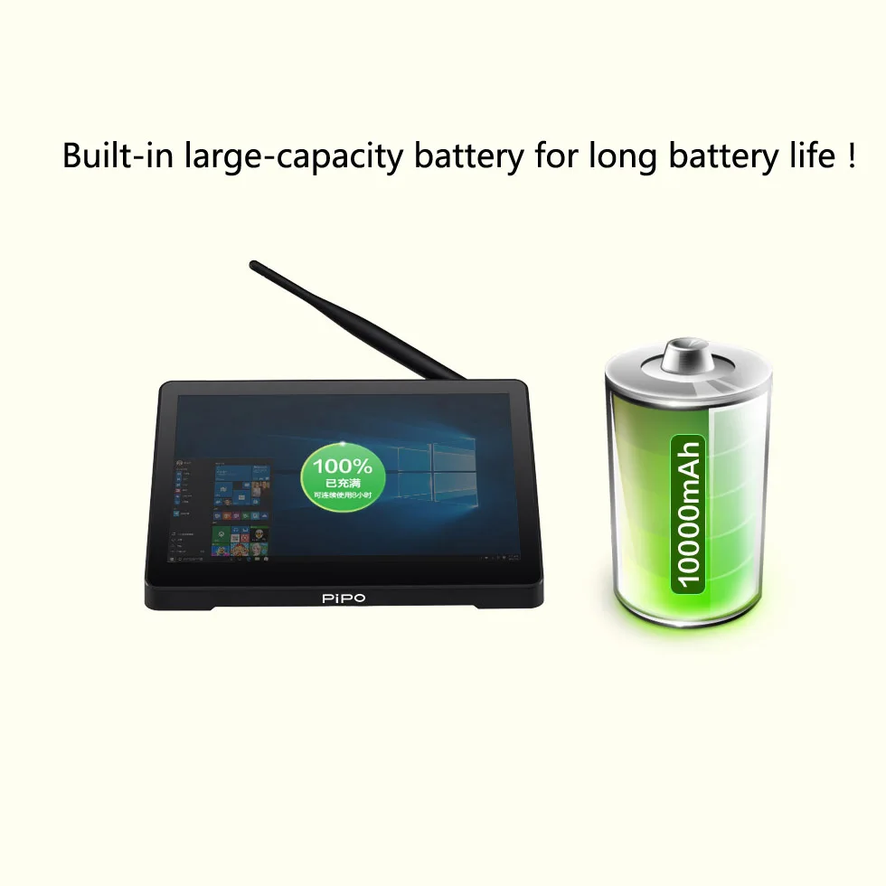 Please NOTE: PIPO X12 has bult-in battery with Win 10 Home.
