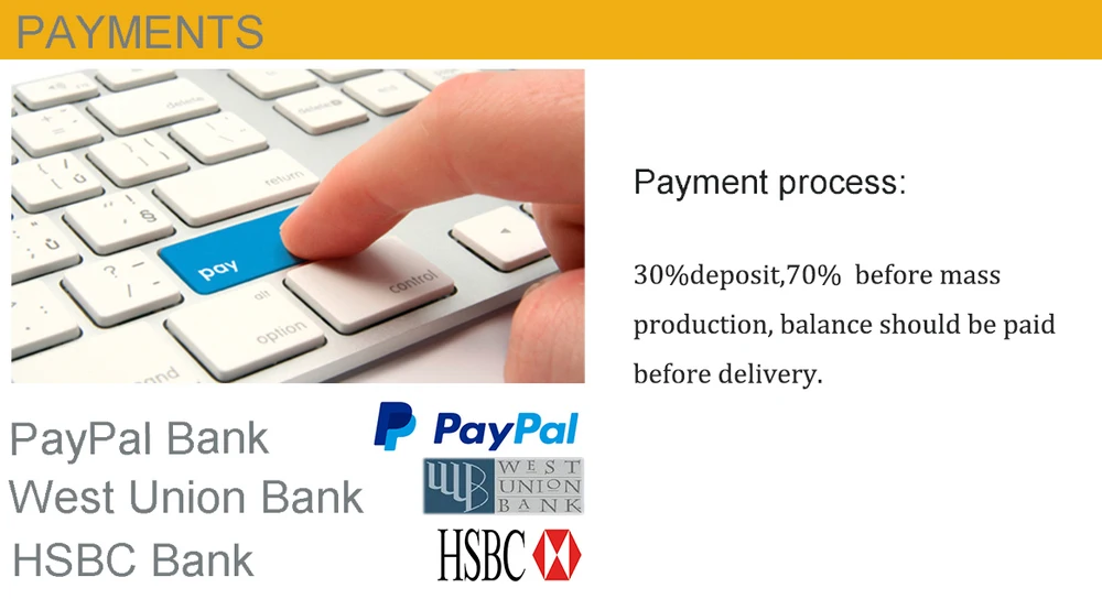 2. Payment>=1000USD, 30% deposit , 70% before mass production , balance should be paied before delivery .