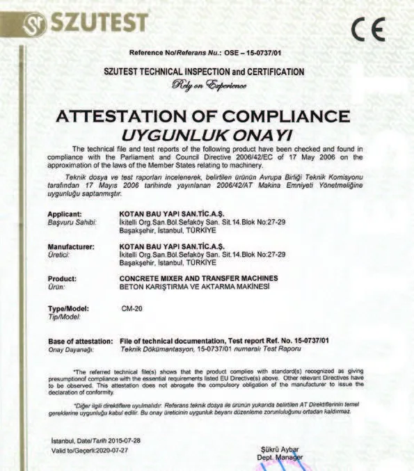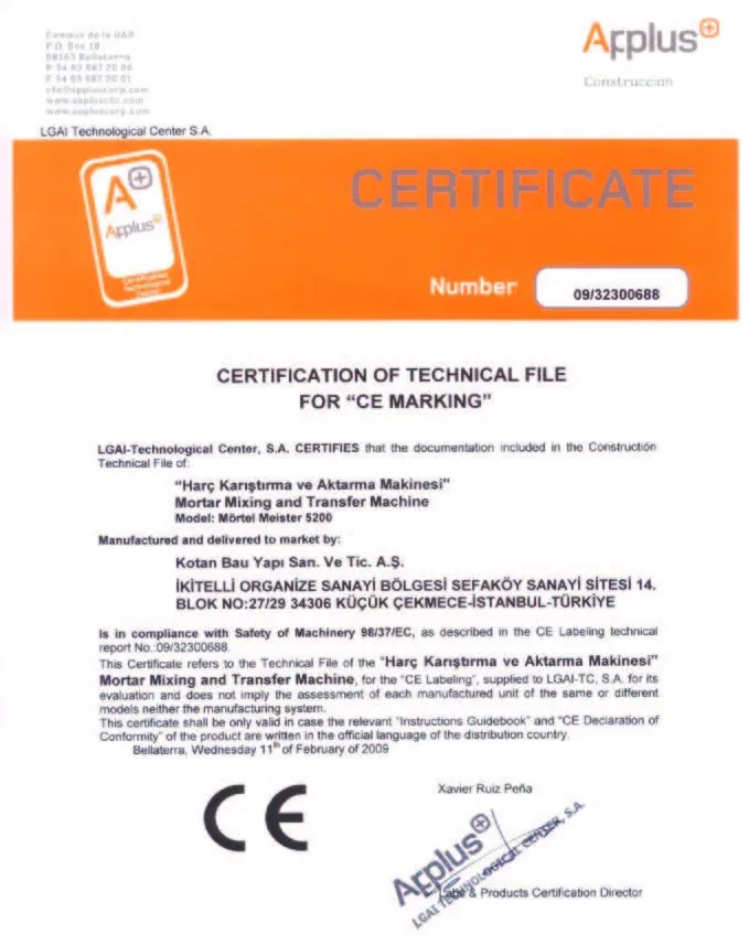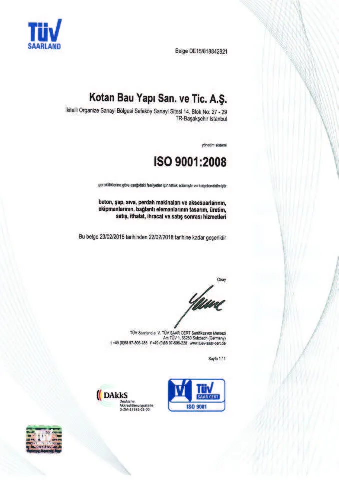 Manufacturing products complying with the global standards, Kotan Bau Yapi has certified all its operations with ISO 9001-2015 and its machines with CE and EAC certificates.