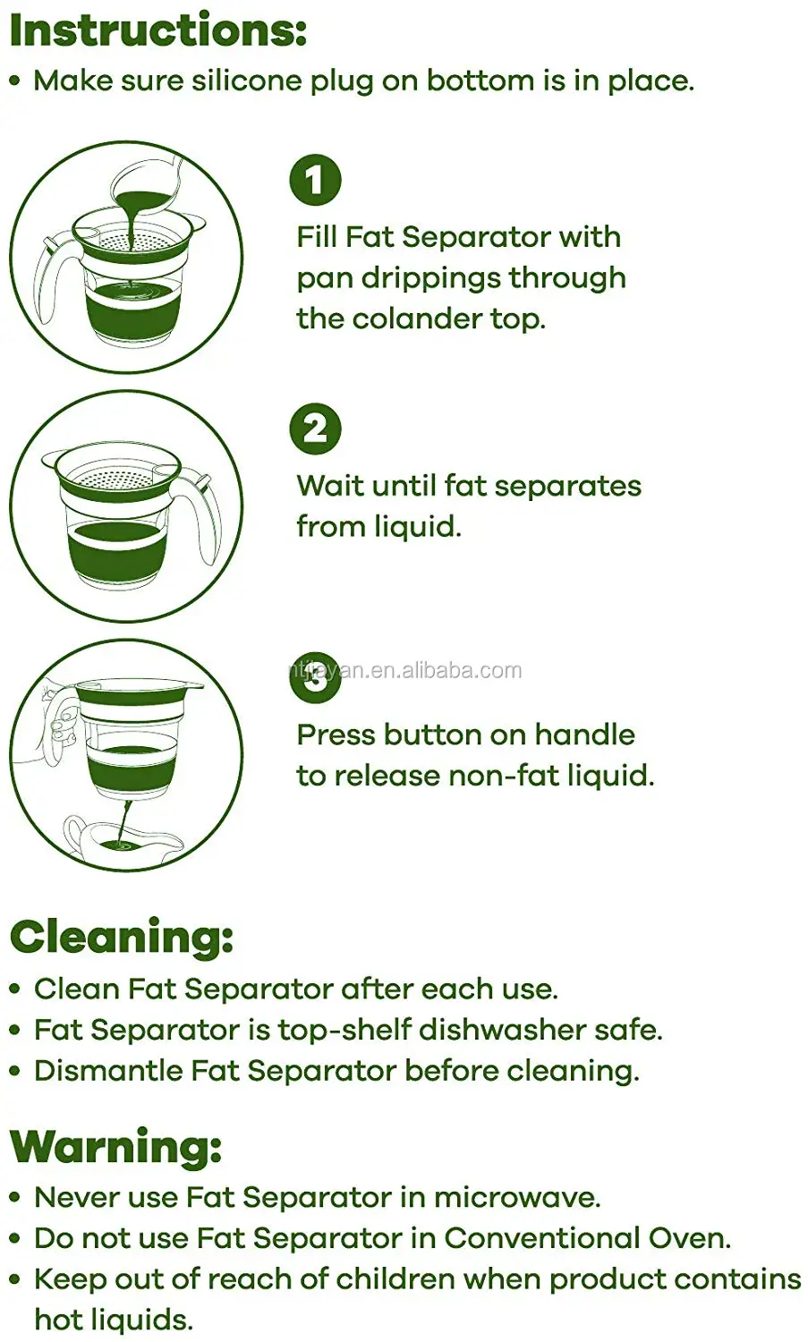 Add drippings from braised, roasted or stewed meats to top removable colander and allow fats to rise to the top. Press button on grip to release bottom silicone plug onto foods or into sauce pan to finish.