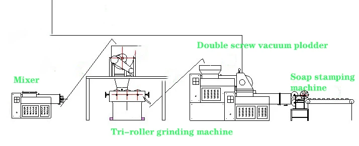 Затем Смешанная мыльная лапша входит в трёхроликовую мельницу конвейерной лентой, Шлифовальный мыла лапши вМылоТонких листов.