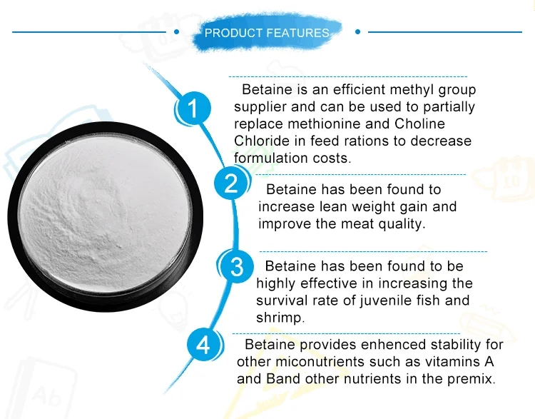 Specification: Item96% betaine Angydrous98% betaine AngydrousContent≥96%≥98%Loss on drying≤2.0≤2.0Heavy metals≤0.001≤0.001