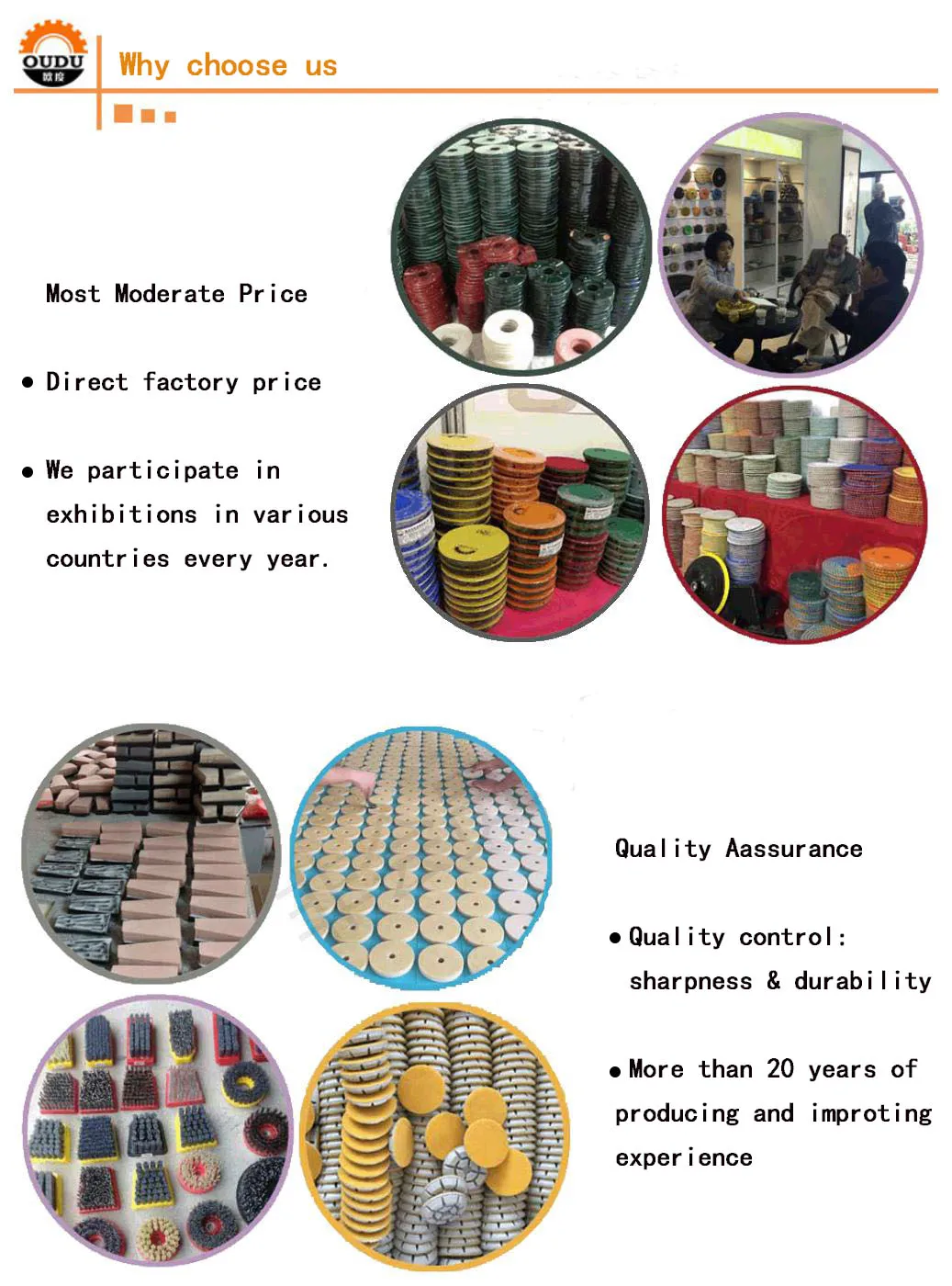 Others | 80mm, 100mm, 125mm, 150mm, 180mm, 200mm, 225mm, 250mm | 1.8 mm, 3mm; 6mm; 8mm; 10mm, etc | For marble, granite , quartz, terrazo, epoxy, concrete polishing, etc. |