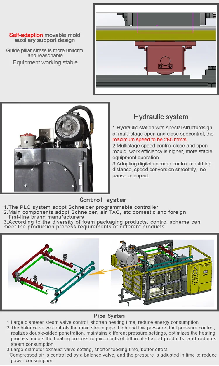 The machine can automatic and efficient carry out heating , cooling , feeding and ingot stripping process to adapt to different EPS products. Various of heating methods can be optionally used as per the product form so as to ensure the product quality. A vacuum and negative pressure system can ensure a low water content , rapid shaping , and shorer drying period ( or without drying)