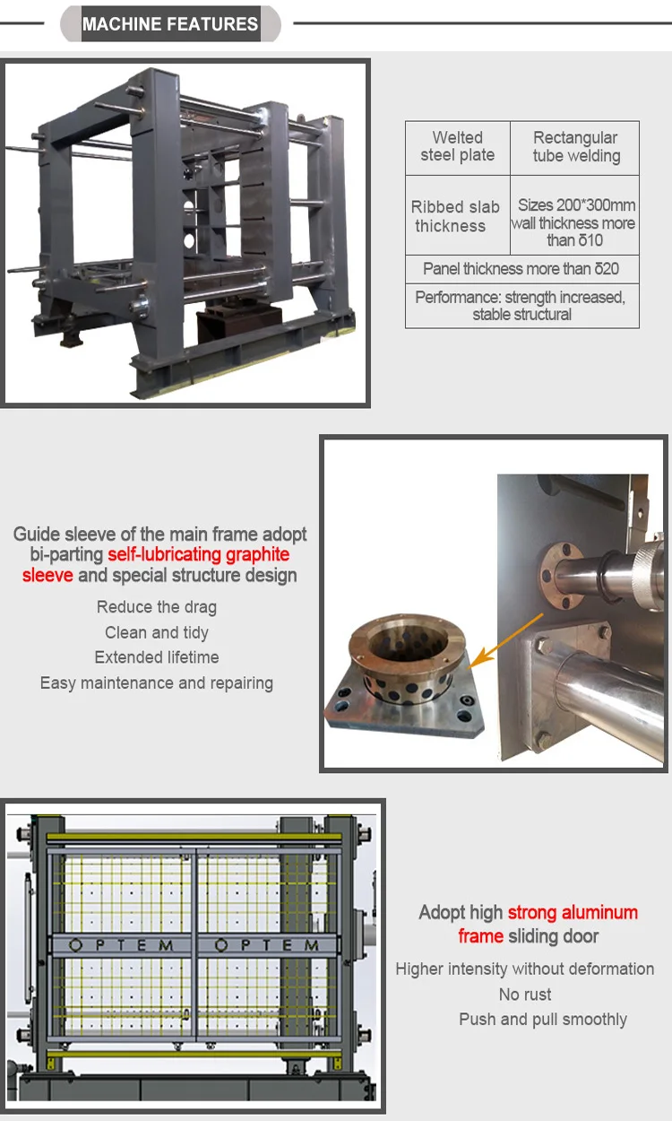 The machine is driven by hydraulic pressure with a fast/slow differential system to ensure the precise time for mould opening and clozing in an economized time and stable operation.