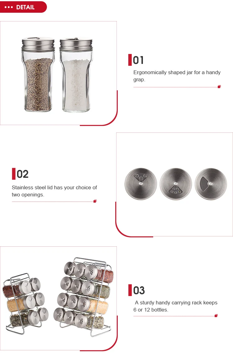 Advantages | Our popular LIBERTY spice jars have a new and simple S/S lid. Turn the top to choose an opening. The handy carrying rack keeps 6 bottles wherever you need them. • A simple twist on a popular style. • S/S lid has your choice of openings. • Spice rack holds 6 or 12 of your favorite spices. |