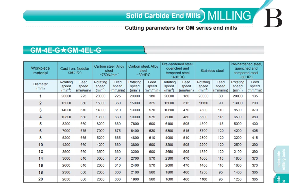 Применимая Таблица матрматериала заготовкиGM-4E-D10.0 твердосплавные фрезы 4 флейты фрезы