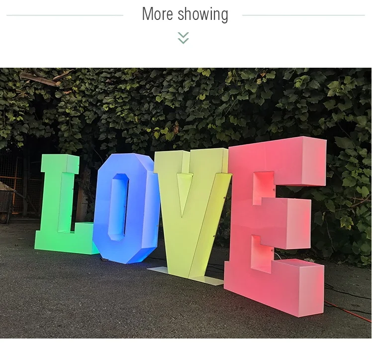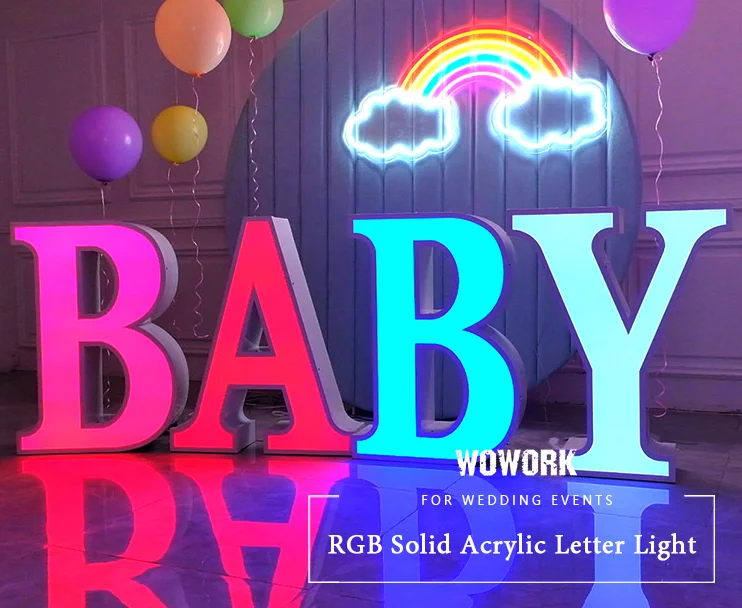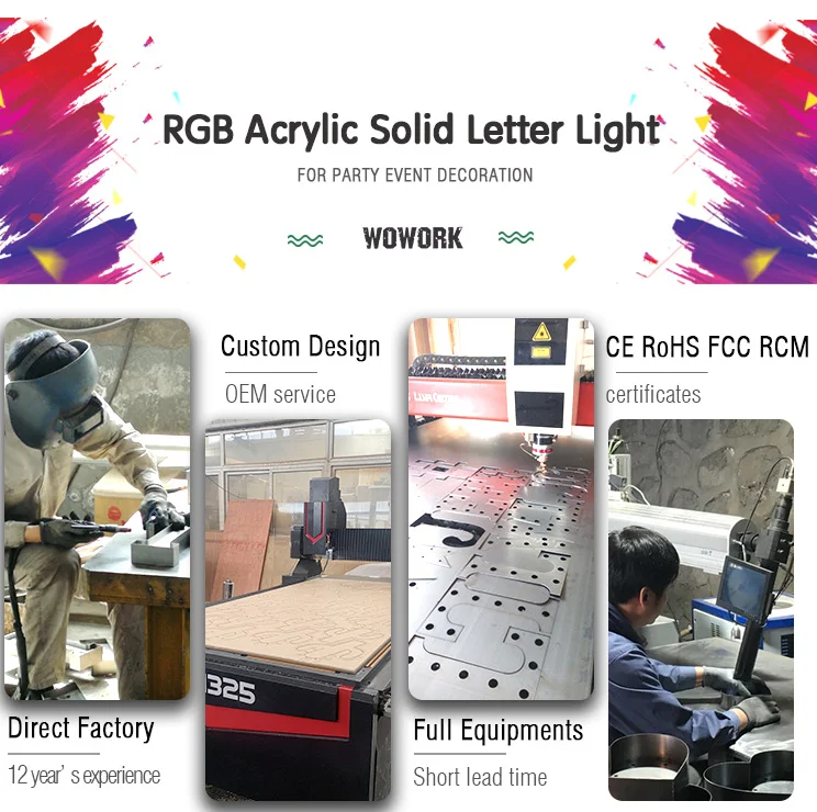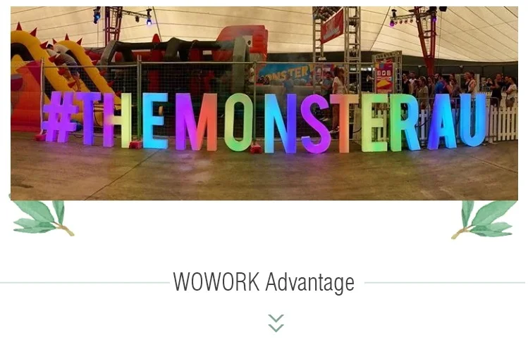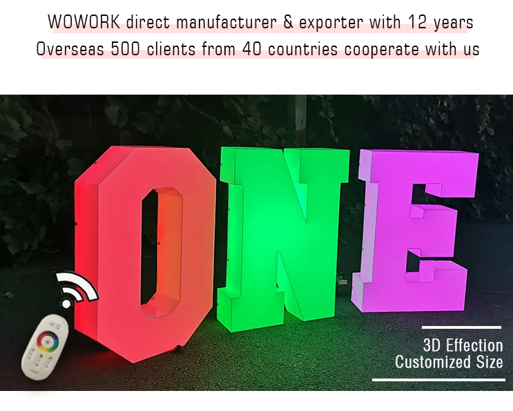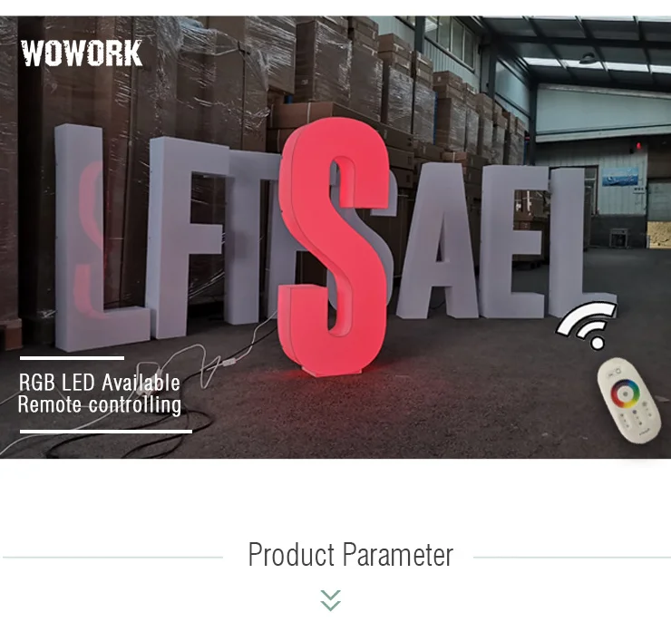 Name | 2021 WOWORK custom waterproof outside send beach rgb 3D big plastic solid acrylic letter for party stage decoration | MOQ | 1 pc |