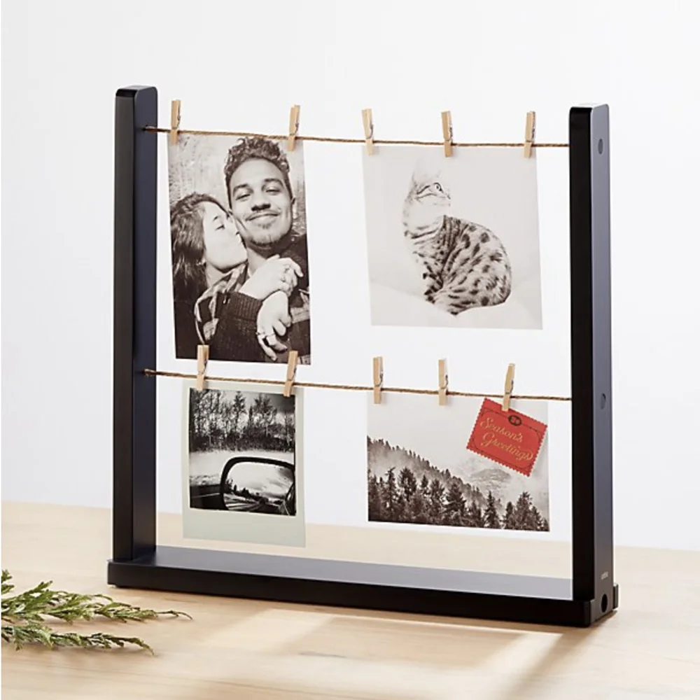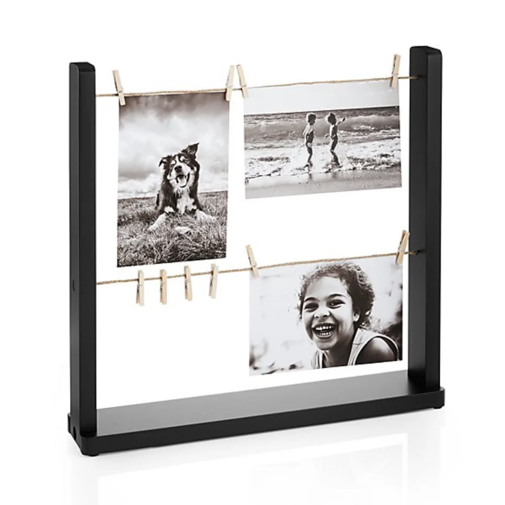 Air out your photo collection with this novel picture frame. Like old-fashioned laundry lines, tiny clips fasten snapshots onto lines suspended within in the black wood frame.