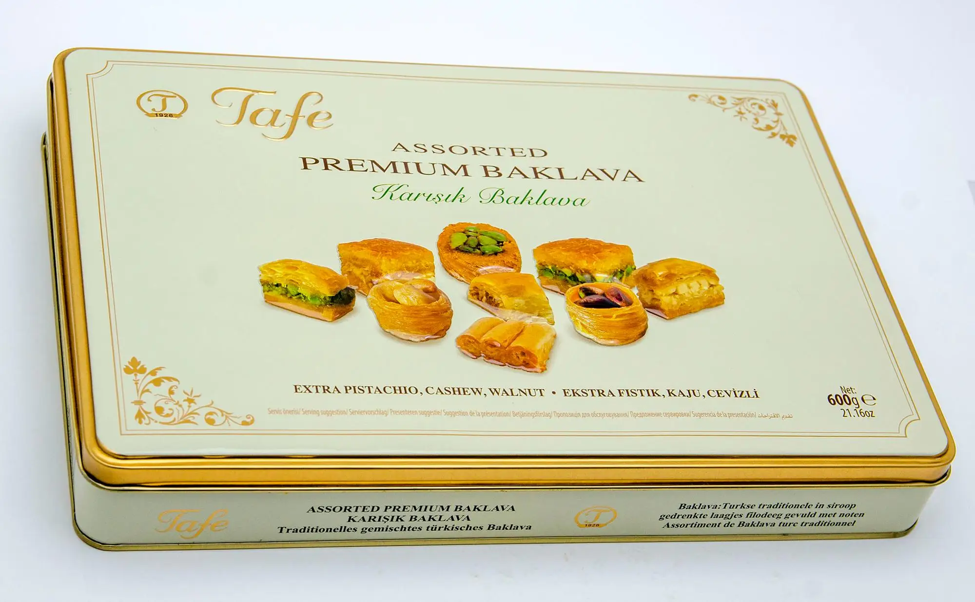 CONTAINS WHEAT FLOUR AND STARCH (GLUTEN), CLARIFIED BUTTER AND MILK POWDER (LACTOSE), EGGS, PISTACHIO, CASHEW, AND WALNUT. MAY CONTAIN TRACE AMOUNTS OF OTHER NUTS AND SESAME.