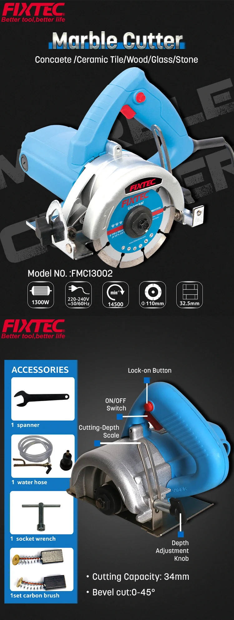 FIXTEC Hot Selling 1300W Marble Block Cutter Saw Electric Marble Cutter 110mm | ||||||