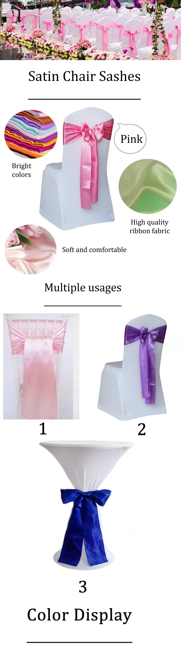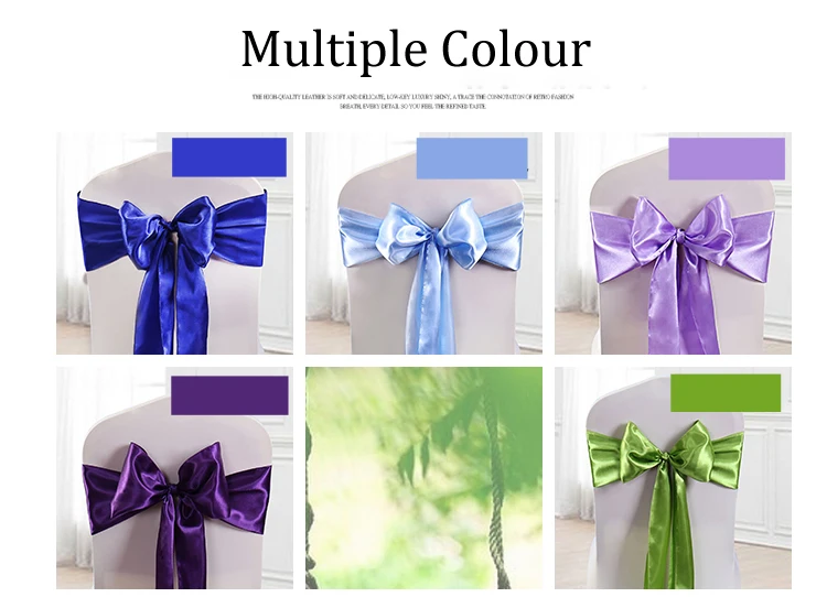 *Features | 1、High-quality Satin Fabric Sashes Bows Beautifully transforms chairs ; 2、Resistant to fraying; 3、Premium-grade satin is highly resistant to stains and simple machine-wash care allows for repeated use at many different functions. | |||||||