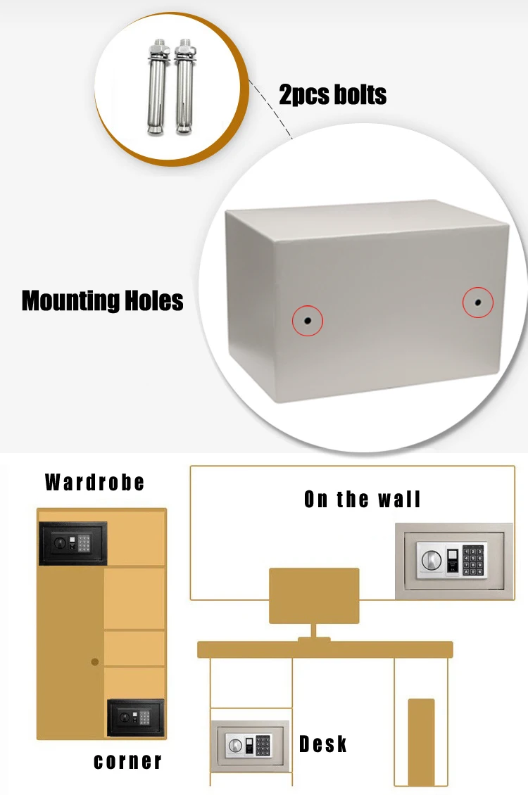 5) Pre-drilled holes inside the safe with fixing bolts allowing permanent mounting to any surface