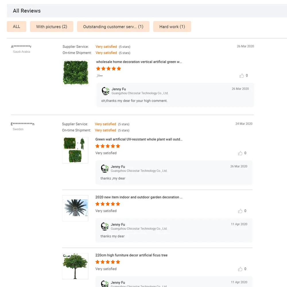 With 10 years experience in artificial plants industry, Artiker Technology Co., Ltd specialize in designing and manufacturing internal landscape artificial plants, Garden Landscape and Decking Artificial Trees, Five star Hotel and 5A office Artificial green wall, Modern Furniture Attraction Artificial bonsai tree. With more than 5000 m2 factory, our company products has got good reputation in the Middle East and USA market. We supply OEM, ODM service. We have cooperated with big artificial plants distributor at Amazon. But also we are willing to support small distributor or agent business. Such as MOQ: 1pc, Customized products service. Etc. So far, Our main market is North America, Europe , Australia, Middle East, Middle Asia. etc Our products contain made-up plants, semi-finished tree leaves. We want to build good relationship with oversea manufacturer and improve cooperation scope. To supply technology guide for our oversea agent, supply semi-finished leaves, let our clients can manufacture on site, reduce shipment cost and shorten delivery time. 80% of our plants are fire-retardant and uv-proof. Our products have been tested and approved by SGS and Domestic Quality Test Institution. Up to now, our fabric series plants and PE series plants has acquired UV-proof Certificate(V2 level) and Fire-retardant Certificate(250 hours).