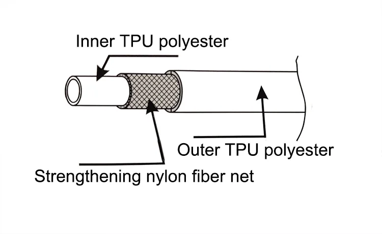 Performance | Working pressure is the single-layer PU hose 's 1.8 times. Non-toxic, tasteless, the service life is double the twice of simple PU hose. |