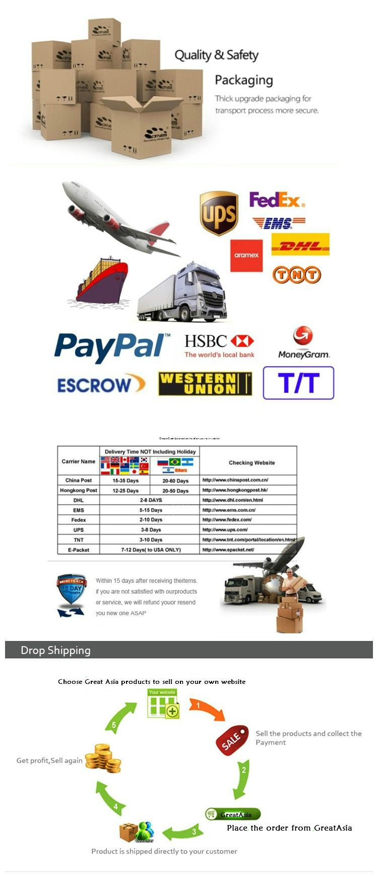 A5: Мы предлагаем как можно больше вариантов доставки, как, например, DHL, UPS, FedEx, TNT, SF Express, TNT ,EMS, для того, чтобы наши клиенты могли получить свой товар быстро на двери. Мы также отправляем по экономичный метод, таких как авиаперевозки грузов и по морю, прямую доставку, воздушная почта в соответствии с запросом клиентов.