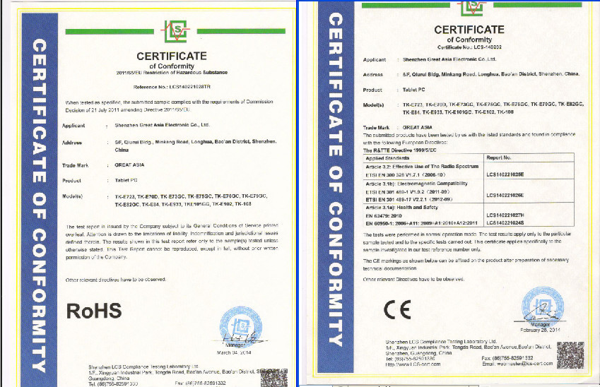 Все наши Tablet PC/MID прошли сертификат Европейского соответствия, сертификат независимого Испытательного и сертификационного FCC фирмы mlight, ec (ROHS) по запрещению применения опасных веществ, CCC сертификаты и горячей продажи в Европе, Северной и Южной Америке, Юго-Восточной Азии, ближний Восток и другие страны и регионы.