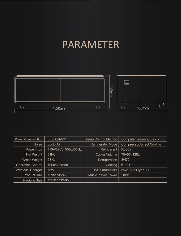 Function Description | Fridge/Music Player/wireless charging /USB charger/Electric outlet |