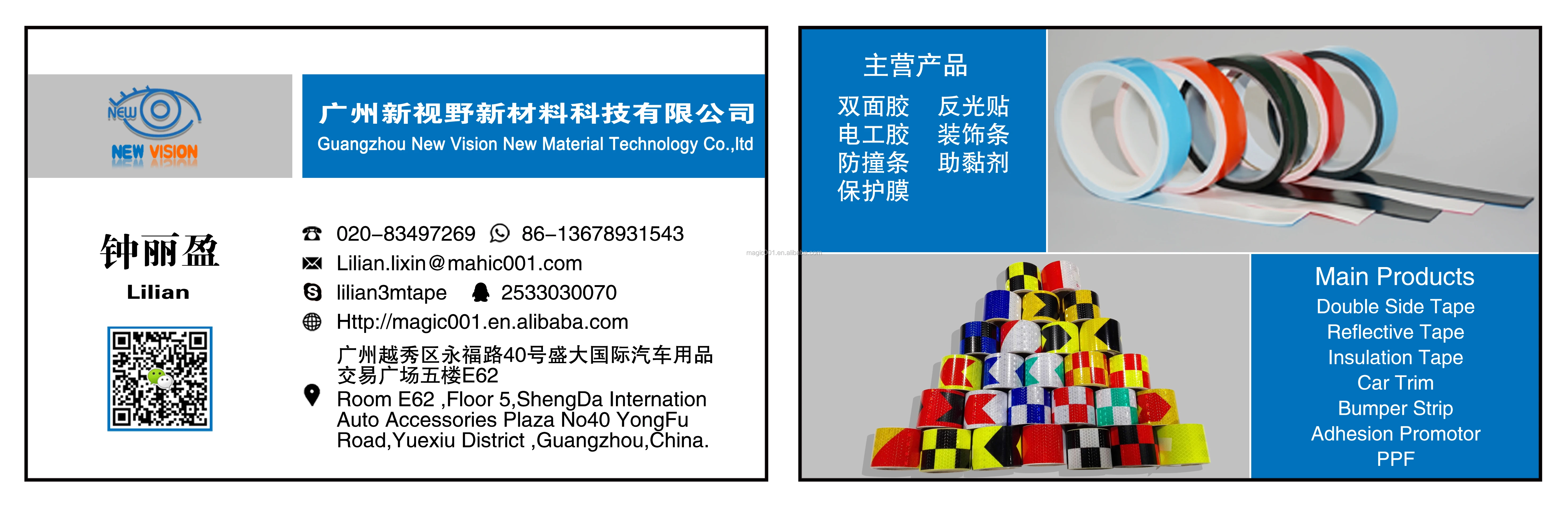Guangzhou New Vision New Material Technology Co.,ltd is a manufactory established on 1997 in China, Which specialized in double side tape, reflective tape, electric tape and wheel rim protector ect car accessories for more than 10 years. New Vision is our own brand.