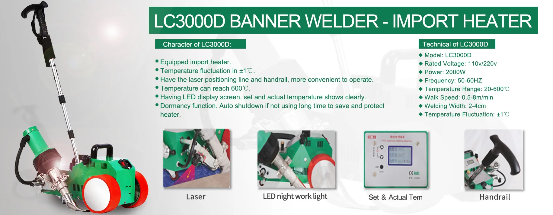 LC3000D Temperature Adjustable Automatic Overlap banner Welder Welding Machine is designed to weld plastic materials. It can weld advertising inkjet fabric, inkjet cloth, light box cloth, thick PVC cloth, mesh cloth, tarpaulin and other PVC, PE, DHPE, LDPE, EVA, Pp plastic materials that can be hot melted.