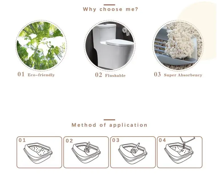 4. The molecular structure of crystalline starch cat litter will immediately agglomerate, so as to absorb urine and lock the odor. When it is discarded in water, the agglomerate will dissolve quickly, and it can be washed completely without blocking the pipeline. Lumps can also be discarded in odorless trash bags.;