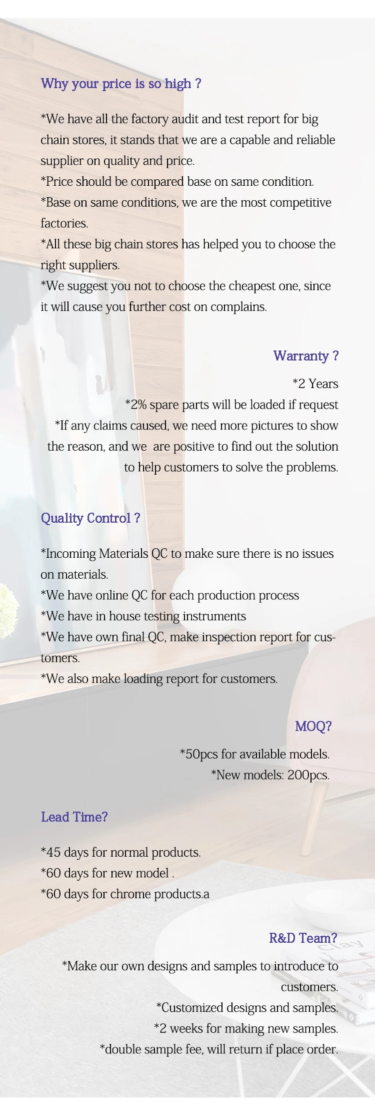 We have our own product development team, and we could make samples for your own designs or make designs especially for your market. We have been dealing with many big chain stores, like Walmart, Target, ACE, Overstock, Wayfair and etc.