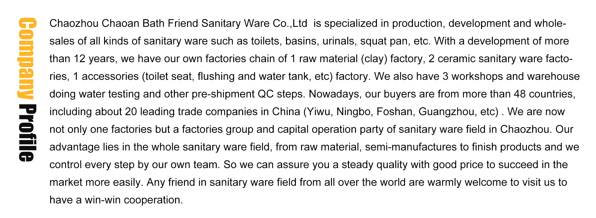 A: We are a manufacturer with 18 years ceramic sanitary ware production experience and 12 years toilet accessories (seat, flushing, etc) production experience. You are welcome to visit us.